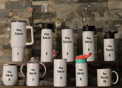 We offer a wide range of customization options for all of our handmade crafts. Choose your drinkware and size to make it truly your own. You can send us a photo, and we can put it on any of our tumblers.